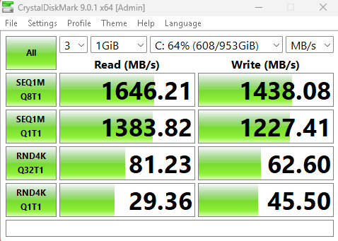 Not bad for a mostly-full 1TB TEAMGROUP with the below paper specs and a $2 PCIEx16 adapter. I’ll have to follow up with a faster NVMe for a fairer look at our motherboard’s expected greater ceiling performance.
