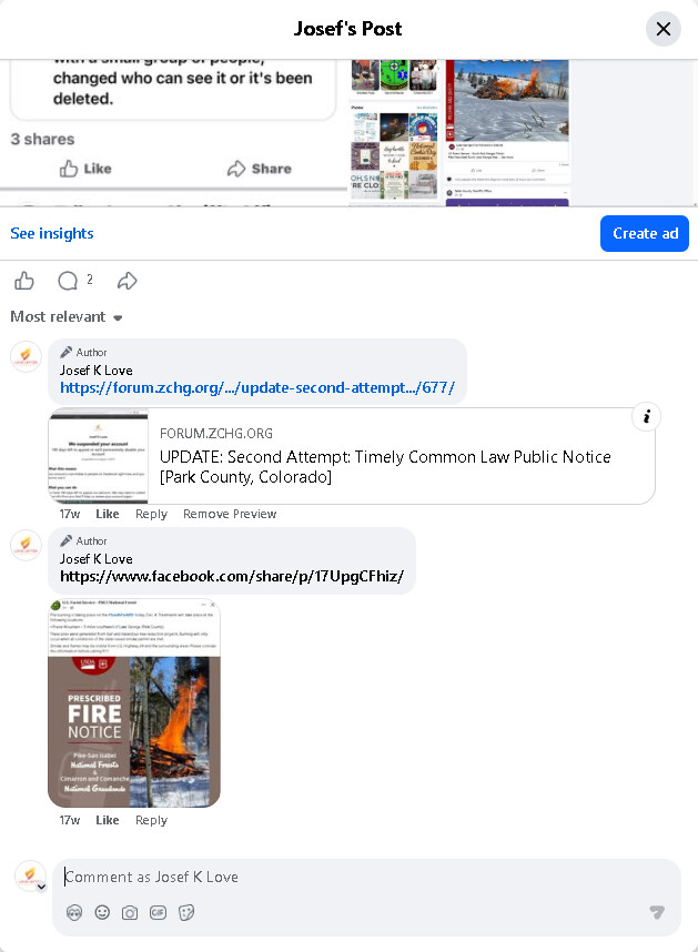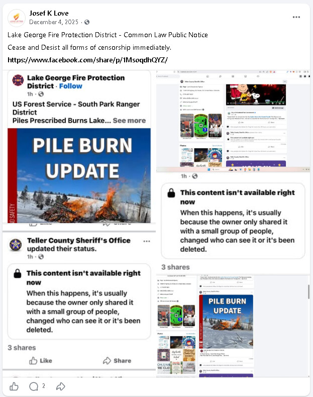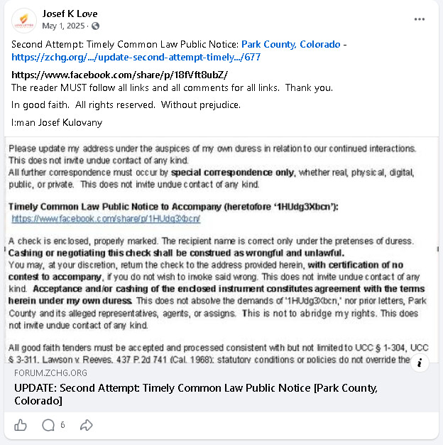 The reader will also note that the original ‘Timely Common Law Public Notice: Park County’ link was rendered in good faith but is not propagating correctly when navigated to directly. No matter, the reader can visit this link by first navigating to https://facebook.com/lovelettermedia OR https://lovelettermedia.org, and then clicking on 'Timely common Law Public Notice: Park County, Colorado - https://www.facebook.com/share/p/1HUdg3Xbcn/ which is pinned at the top of said public media page at time of this publication. Thank you.
